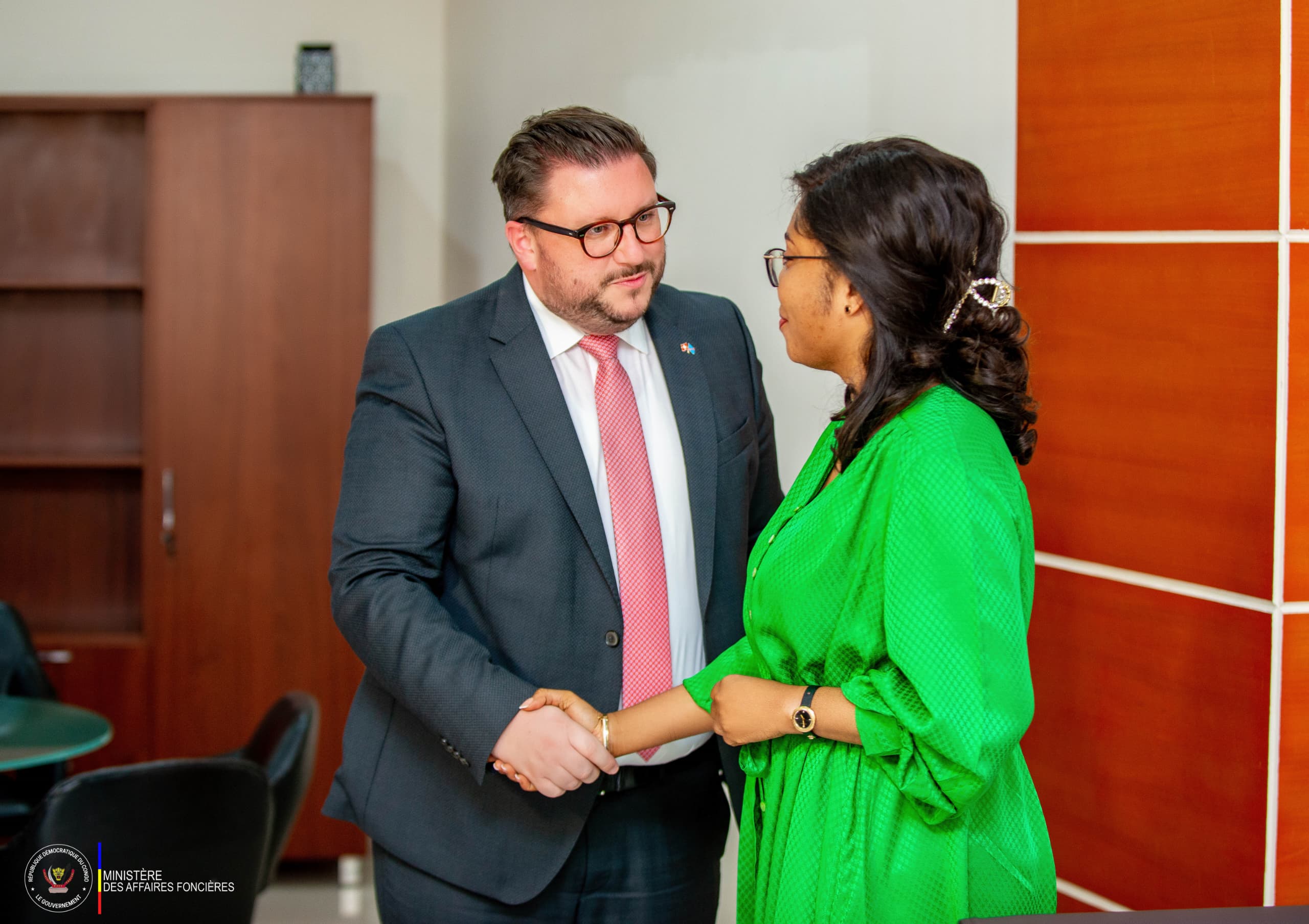 La Ministre d’Etat, Ministre des affaires foncières Acacia Bandubola Mbongo a reçu jeudi 15 août 2024, Mr Chasper Sarott, Ambassadeur de la Fédération Suisse en République Démocratique du Congo.